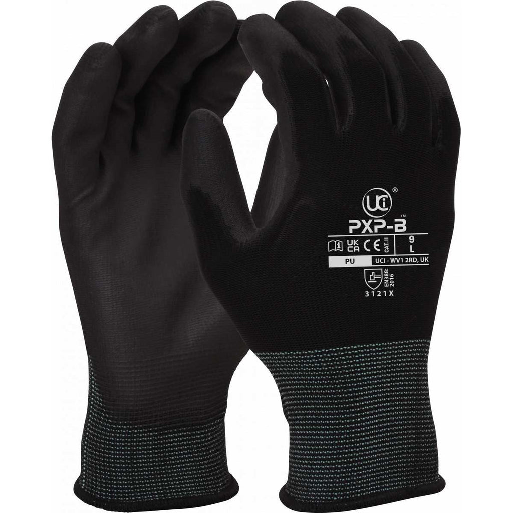 Black PU palm coating on a black polyester shell.